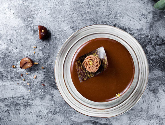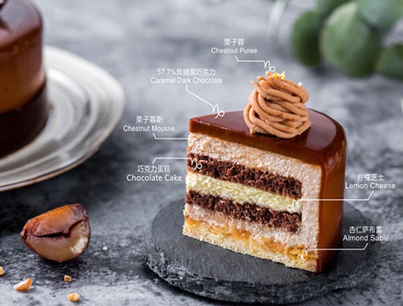 香甜的栗子慕斯與可可濃烈的香氣碰撞,檸檬飄香浸潤舌尖。一切細(xì)滑松軟直達(dá)底部,“咔嚓”一聲的酥脆口感來自鋪滿杏仁的薩布雷,飽滿香脆的堅果給予了最樸實的味蕾熨帖。