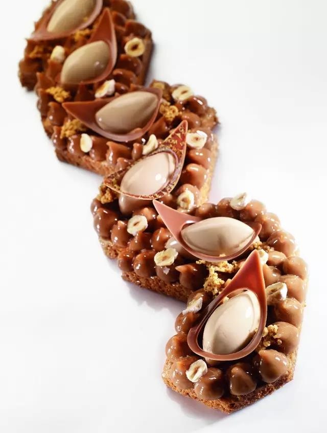 (Christophe在Valrhona學(xué)校) 當(dāng)然,他的成功也離不開團(tuán)隊(duì)的配合,和各方的支持。每一步走來,穩(wěn)扎穩(wěn)打的基本功才能讓天馬行空的創(chuàng)意得到充分發(fā)揮。盡管無法得知他的靈感來源,但Christophe的非凡創(chuàng)意總能讓人眼前一亮,看到這些作品,不得不贊嘆:“真是巧克力的藝術(shù)!” Christophe的作品各有千秋,以他擅長制作的法式撻為例,讓我們感受Christophe Renou帶來的法式甜點(diǎn)的魅力吧。