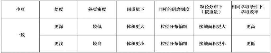 深烘的咖啡在相同的粒徑范圍(意味著基本相同的接觸面積)下,萃取效率有可能比淺烘更慢的。但這一特點無法中和體積帶來的萃取加速,再加上“深烘豆在研磨時更傾向于精細分布”,都支撐著“熟豆密度越低越容易萃取”這個說法。