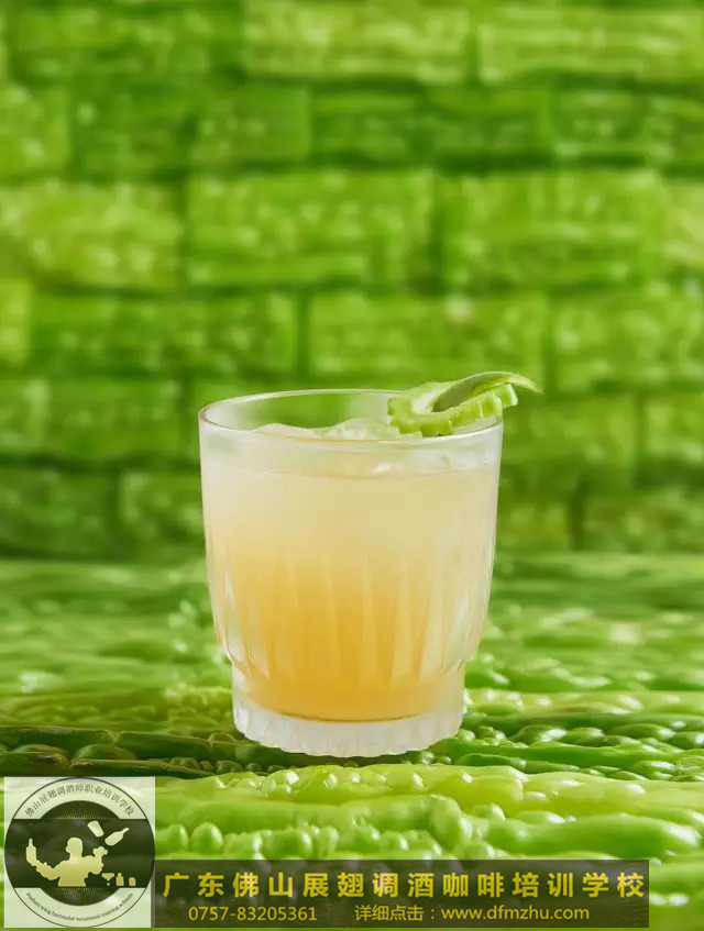 將所有材料搖勻,倒入加冰的洛克杯中。用一個(gè)青檸卷和一片苦瓜裝飾。